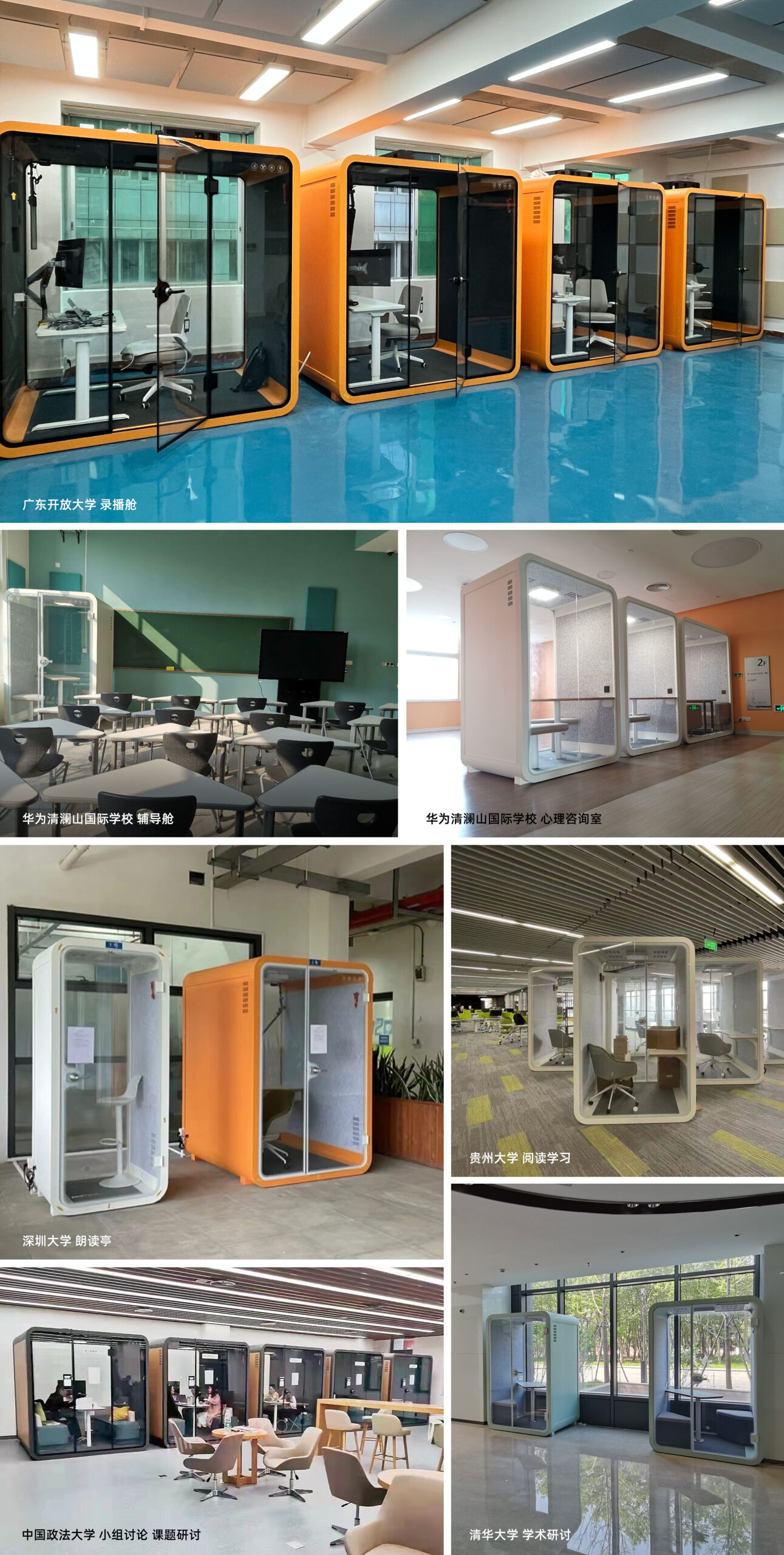 校园内存在许多大空间场所,首先是图书馆,图书馆是学生学习和研究的重要场所,静谧的学习环境对于馆内的学生至关重要。由于图书馆通常是开放式的,里面可能会有大量的学生同时学习,在如此安静的环境下通电话或小声讨论都显突兀。此时,一个独立的隔音空间就非常必要了。