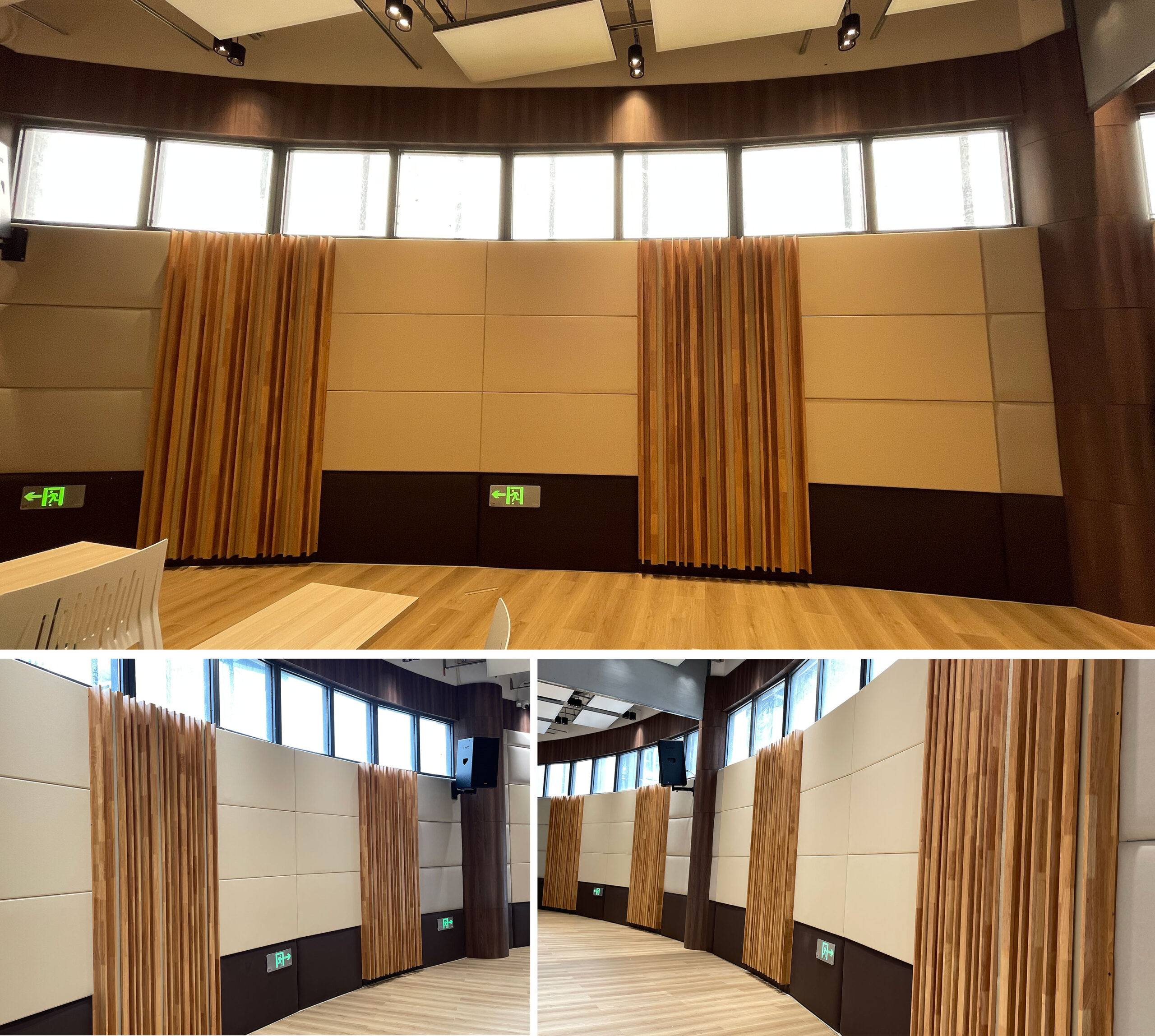 墙面设置MGP绝燃通孔吸声板,吸收中低频能量,以此达到吸收馆内多次来回反射的回音来降低混响时间的目的。